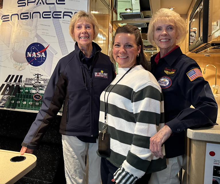 The teachers on the mission were Sharon Ryan, the creator of the STEM Shuttle program, and Sue Bushman who are pictured at right with the school principal, Hillary Day.